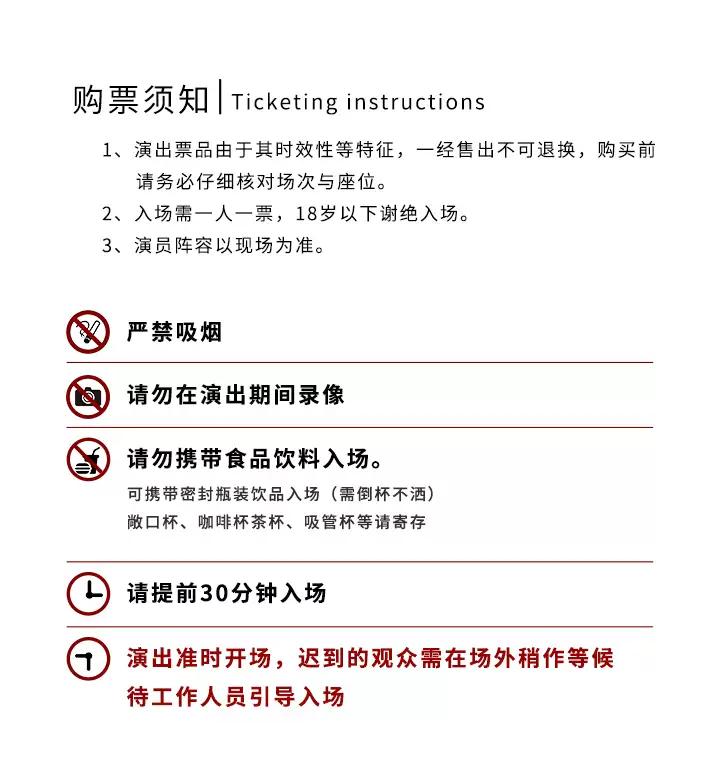 | 座位类型 | 请按门票对应座位,有序对号入座 | 儿童入场提示 | 18岁及以上凭成人票入场,18岁以下谢绝入场 |