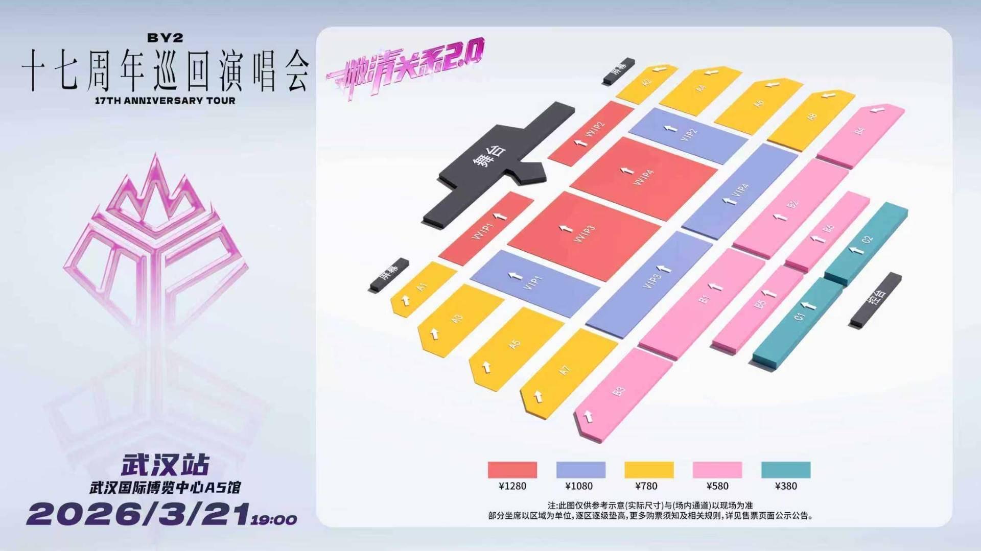 BY2「撇清关系2.0」十七周年巡回演唱会·武汉站于2026年3月21日在武汉国际博览中心A5馆举办。衷心感谢各位观众对本次演唱会的关心和支持,我们将积级响应文旅部发布的《关于进一步加强演出市场管理规范演出市场秩序的通知》的要求,加强对购票渠道的监管,确保购票过程的透明和公平。本场演出具体购票、入场规则如下: