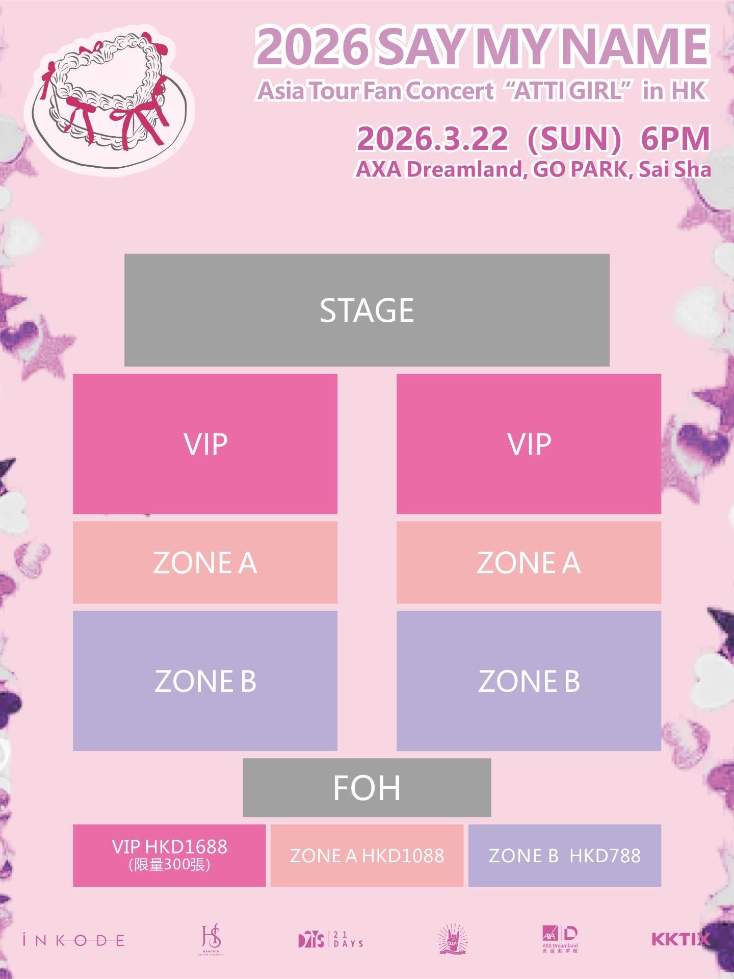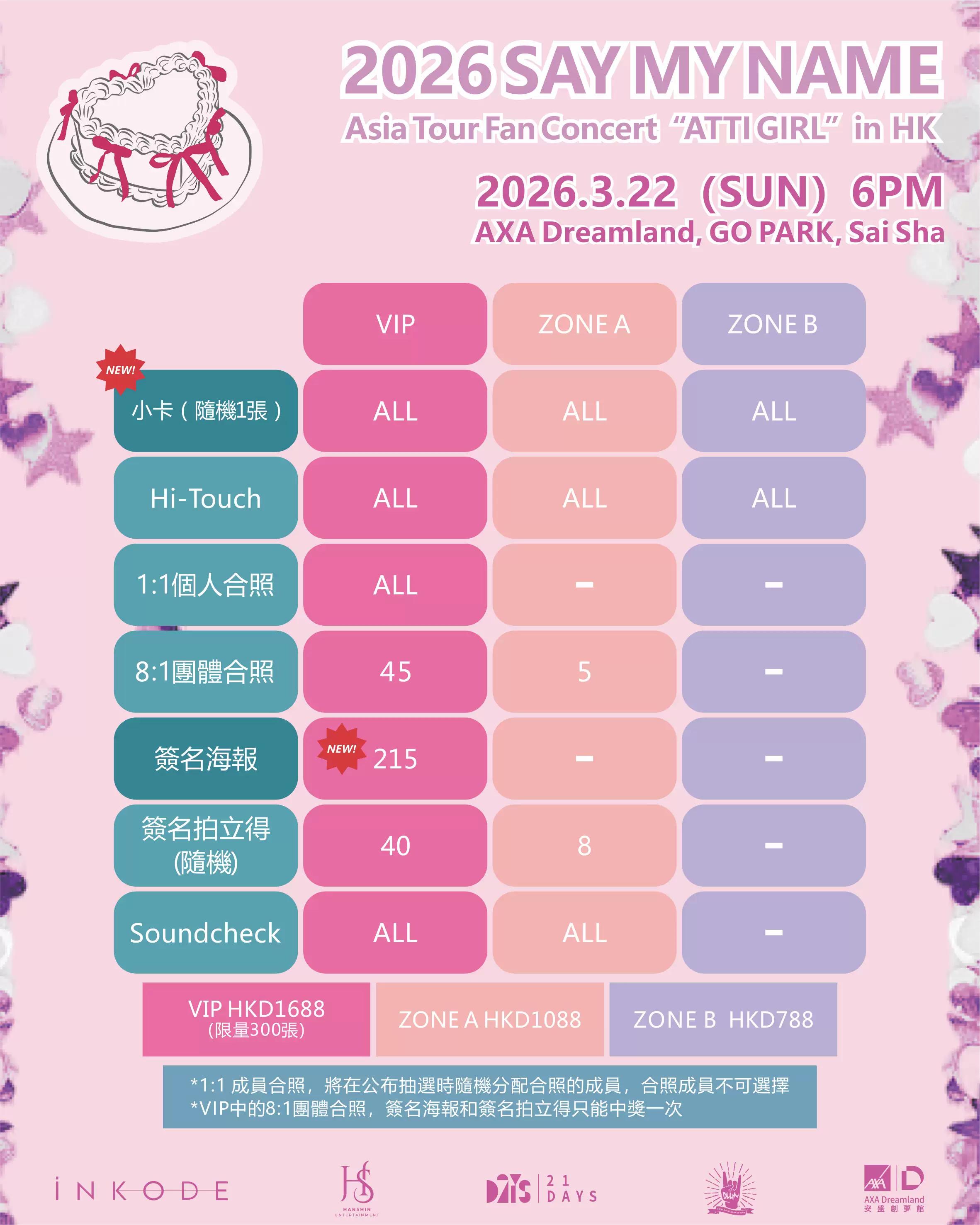 ◦VIP HKD1688(限量300张):包含随机小卡一张、Hi-Touch、1:1个人合照、限量45名的8:1团体合照、限量200张的签名海报、限量40张的随机签名拍立得,以及Soundcheck体验。