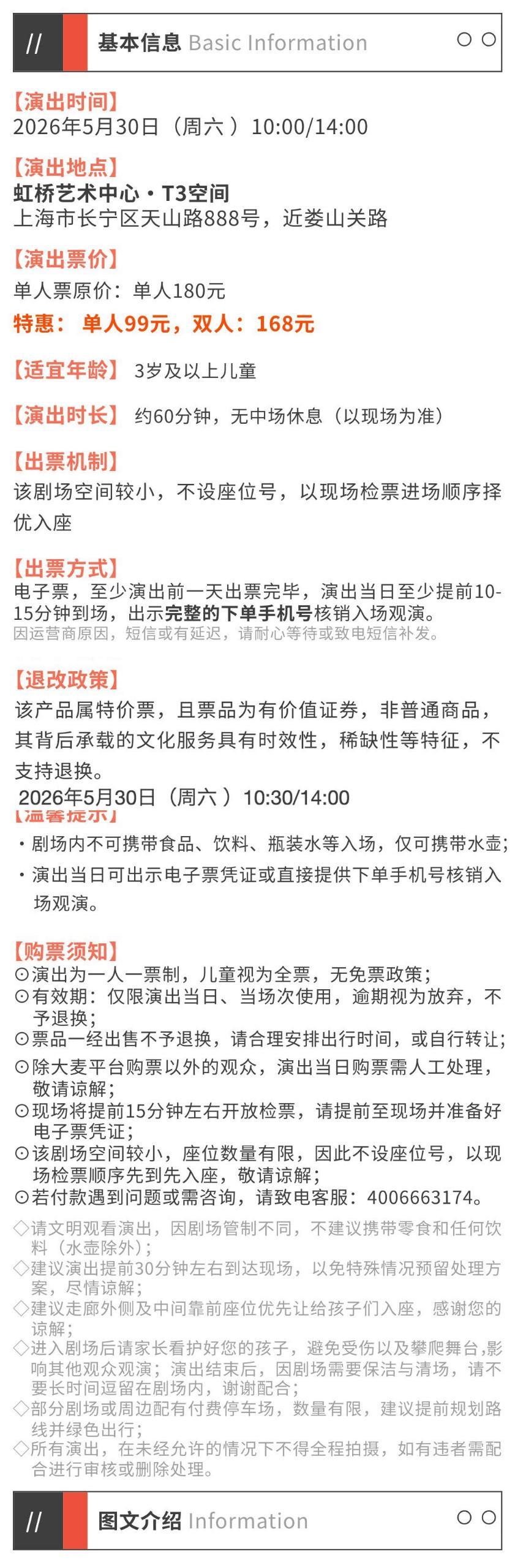 | 座位类型 | 请按门票对应座位,有序对号入座 | 儿童入场提示 | 1.2米以上凭票入场,1.2米以下谢绝入场 |