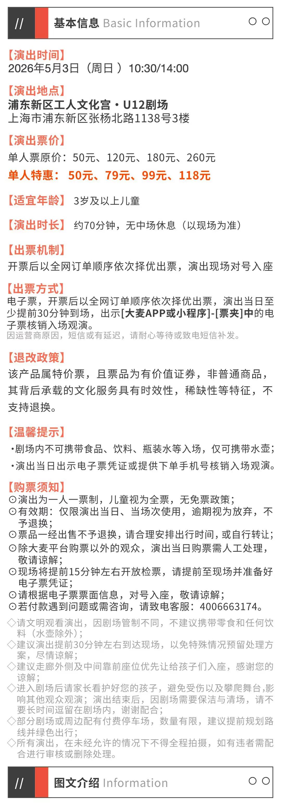 | 座位类型 | 请按门票对应座位,有序对号入座 | 儿童入场提示 | 1.2米以上凭票入场,1.2米以下谢绝入场 |