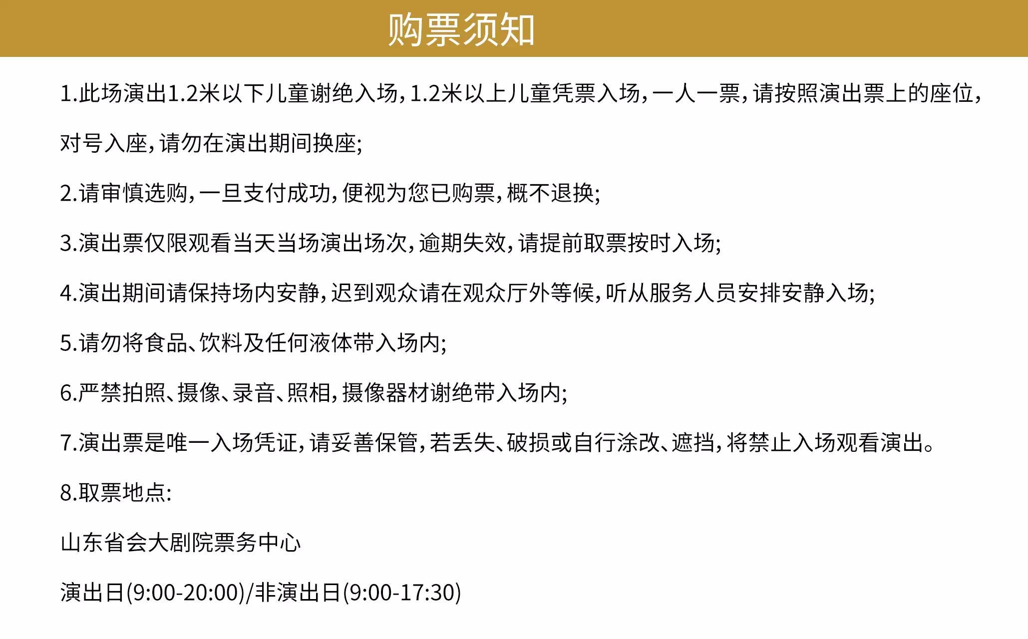 | 座位类型 | 请按门票对应座位,有序对号入座 | 儿童入场提示 | 此场演出1.2米以下儿童谢绝入场 |