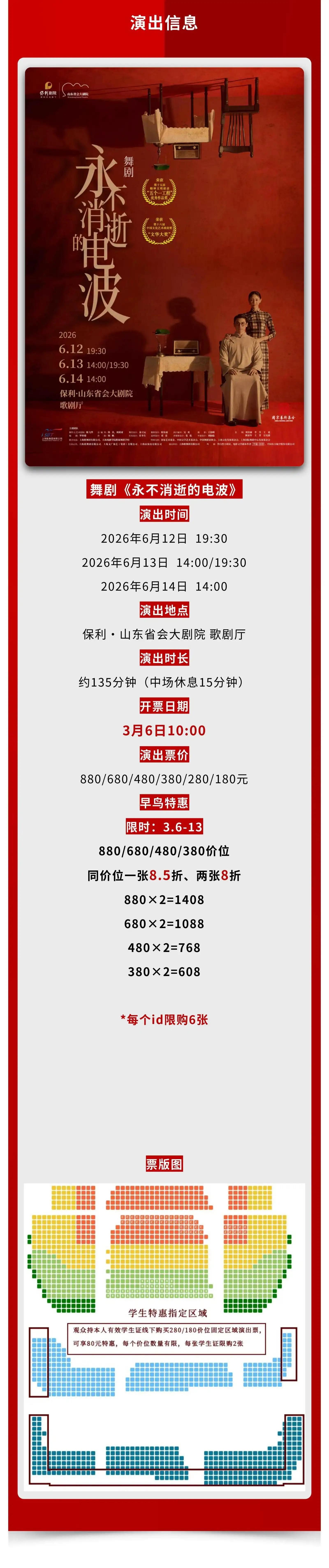 | 限购说明 | 每单限购6张 | 服务费说明 | 为了给您提供便利的在线购票服务,票牛为此投入大量的平台技术支持、运营维护支持,并联合平台入驻商家、第三方在线支付服务商、第三方合作商等合作方为您提供服务,基于前述平台成本及合作方服务费用,票牛向您收取不超过票款5%的平台服务费(最高不超过400元)。 票牛收取的平台服务费,主要可能包括如下内容:1.票牛的线上平台和软件系统开发维护成本。2.支付宝、微信等第三方支付服务商收取的支付手续费用。3.物流公司收取的票品寄送费用(如纸质票)。4.客户服务成本以及短信、电话等通道费用。5.为用户提供购票保障服务对应的运营与管理成本。6.其它为完成用户订单必须的相关服务成本、人员成本等。 |