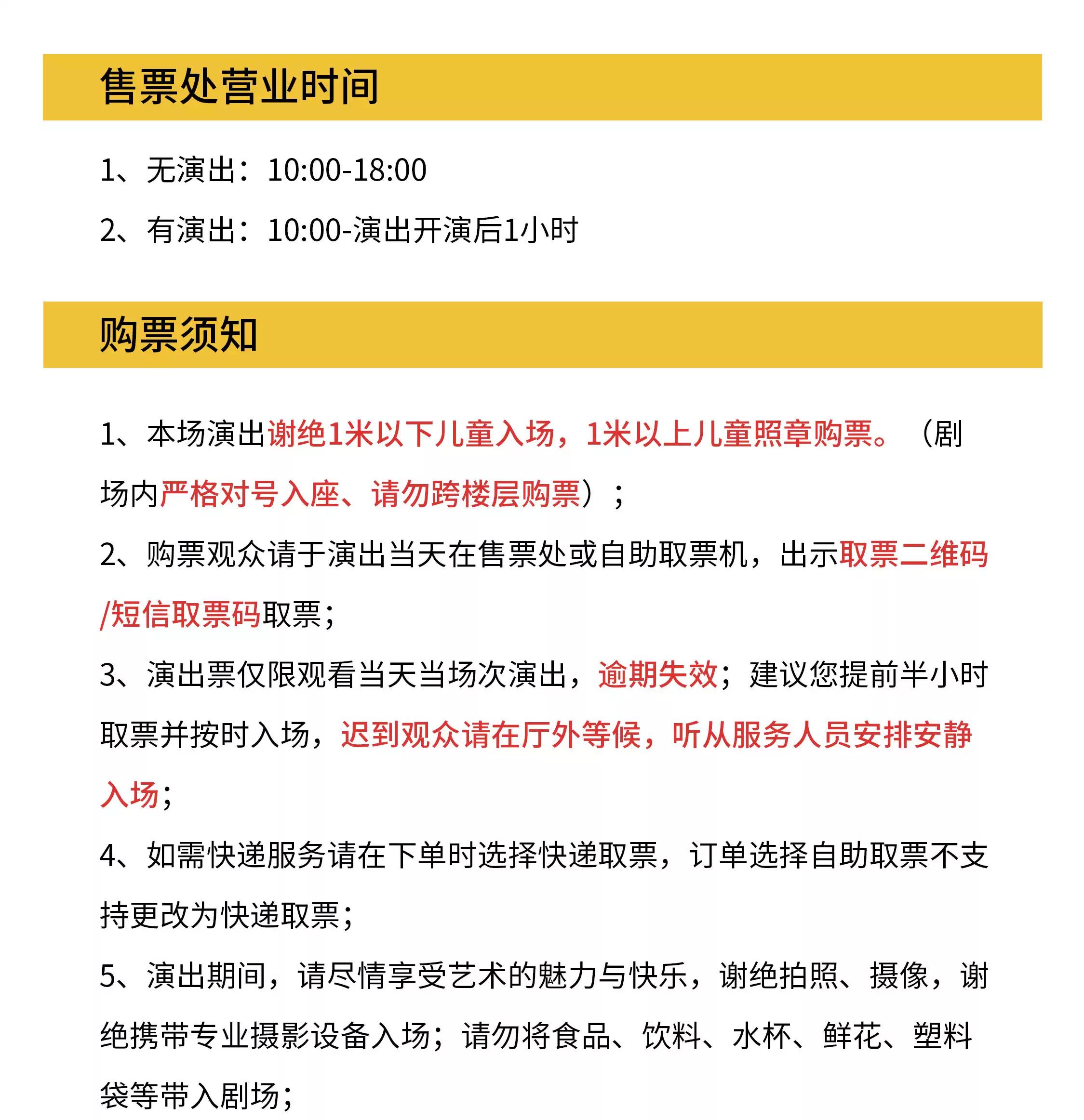 | 座位类型 | 请按门票对应座位,有序对号入座 | 儿童入场提示 | 本场演出所有观众(含婴幼儿)皆需一人一票,凭票入场。 |