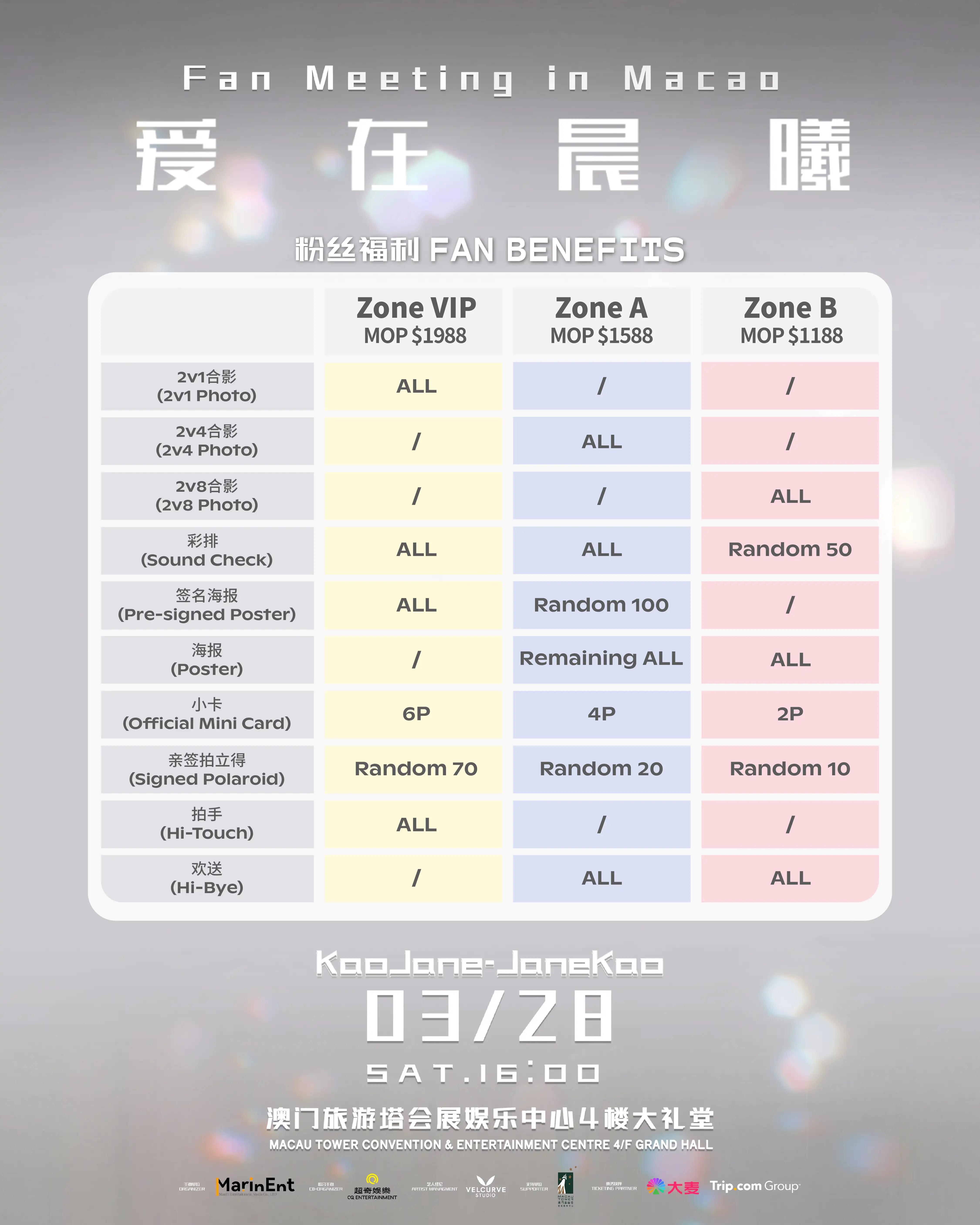 澳门币票价MOP:1988 / 1588 / 1188