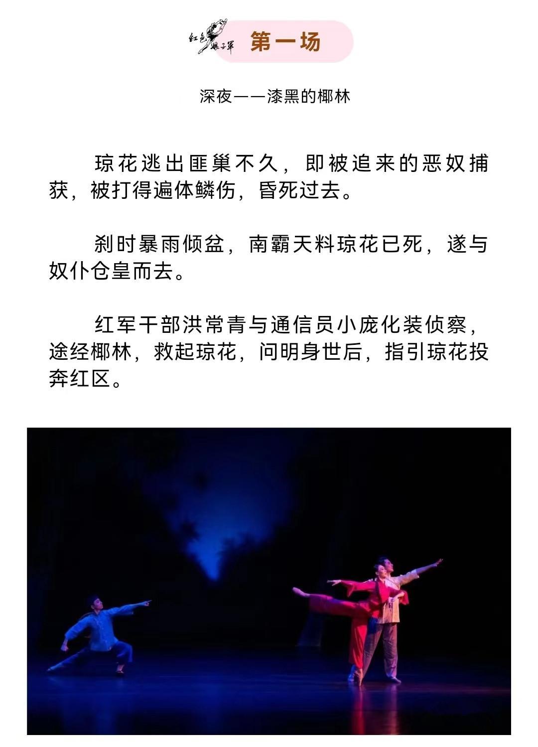 故事发生在二十世纪三十年代的中国海南岛。舞剧讲述了从恶霸南霸天府中逃出来的丫鬟琼花,在红军党代表洪常青以及战友们的帮助下,经过血与火的战斗考验,从一名苦大仇深的乡下丫鬟,逐渐转变成长为一名坚定的革命战士的过程,生动描绘了一幅中国妇女坚强不屈革命精神的壮美图卷。