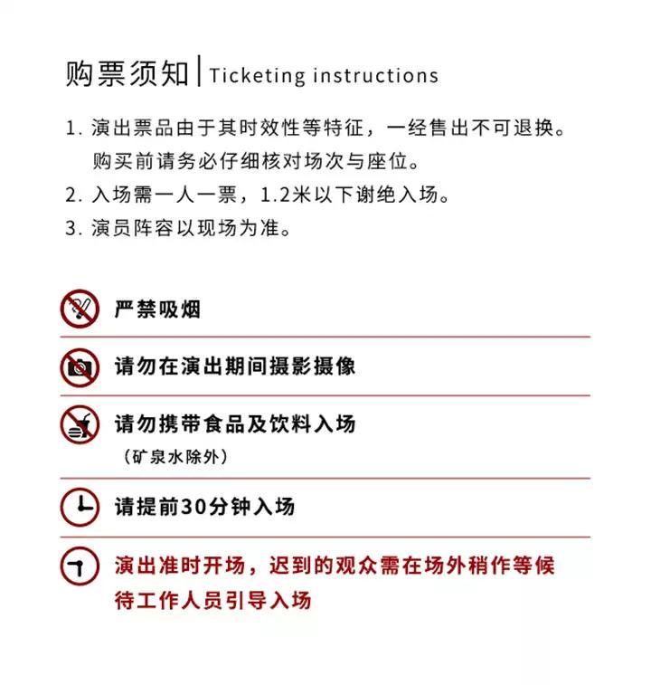 | 重要提示 | 演出现场气氛热烈,请您务必根据自身身体状况酌情是否购票参与观演,特别是患有心脏类疾病、急性心脑血管疾病、心肌炎、高血压等相关疾病的人群,请您务必遵照医嘱,结合病史及个人身体状况进行观演,观演期间请自行承担身体健康相关责任。 | 温馨提示 | 购买前请您提前规划好行程,做好相应准备,以免影响您的正常观演,感谢您的理解和配合。 若演出受不可抗力影响延期或取消,票牛将对演出票订单按照项目官方通知方案进行处理,其他因观演发生的费用需由您自行承担。 |