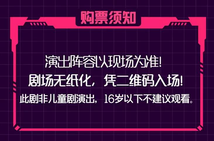 | 座位类型 | 请按门票对应座位,有序对号入座 | 儿童入场提示 | 1.2米及以上儿童凭成人票入场(此剧非儿童剧演出,16岁以下不建议观看) |