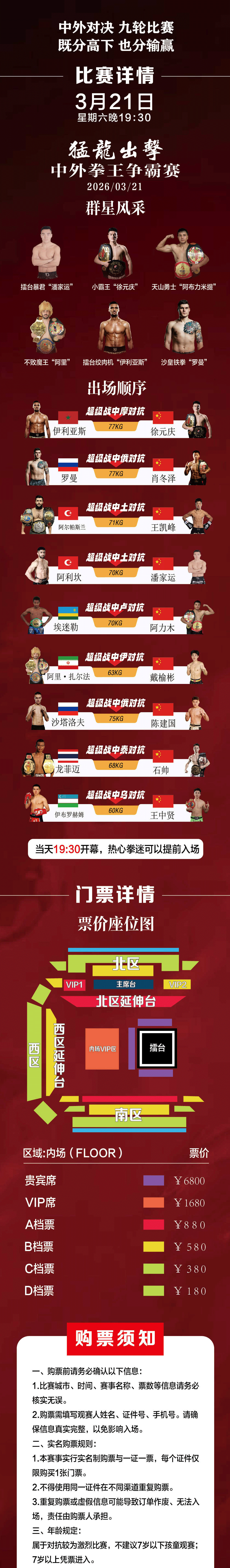 | 儿童入场提示 | 属于对抗较为激烈比赛,不建议7岁以下孩童观演,7岁以上凭票入场 | 禁止携带物品 | 食品、饮料、相机、充电宝、打火机等 |
