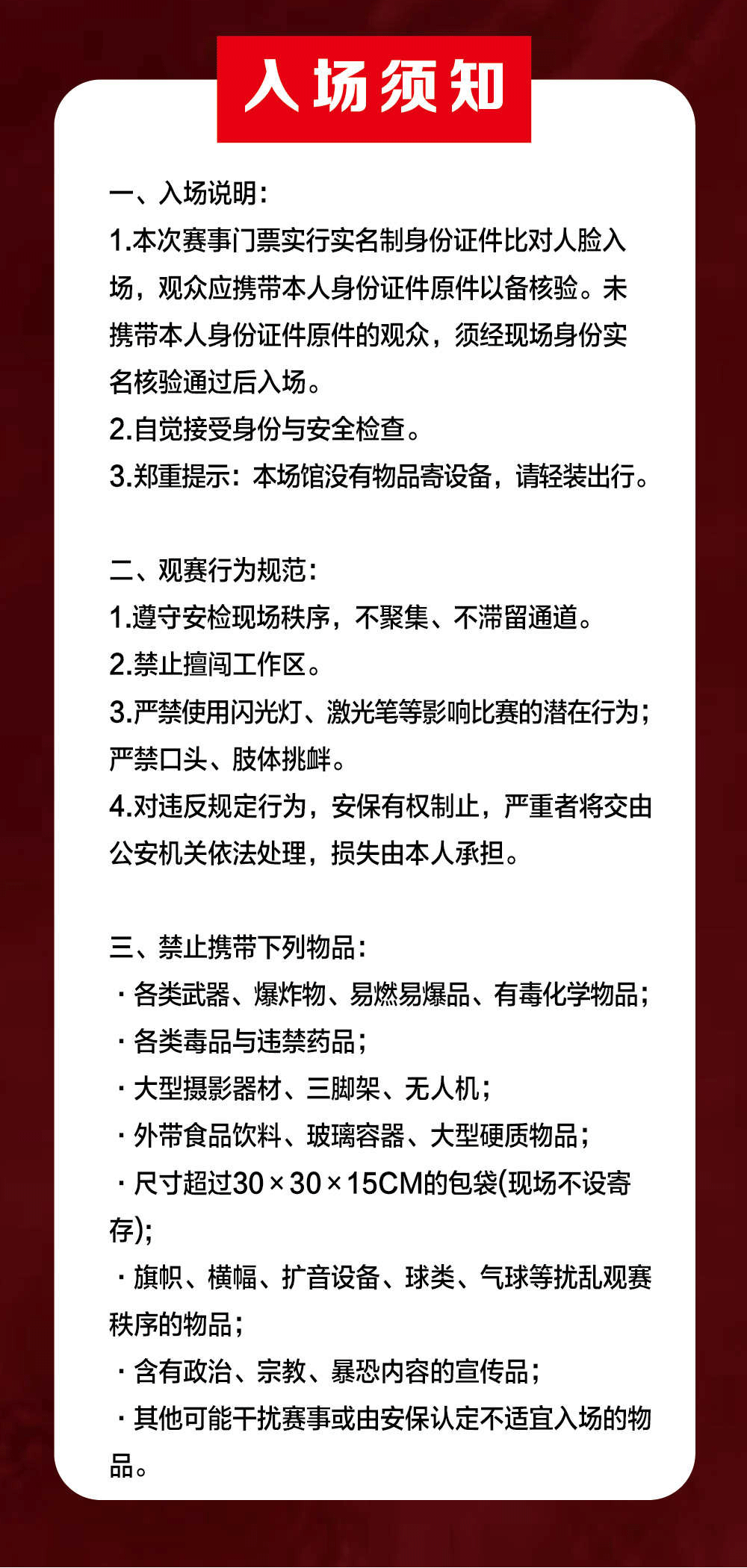 对于现场观众所携带物品中的禁止和限制带入场物品现做详细说明如下: