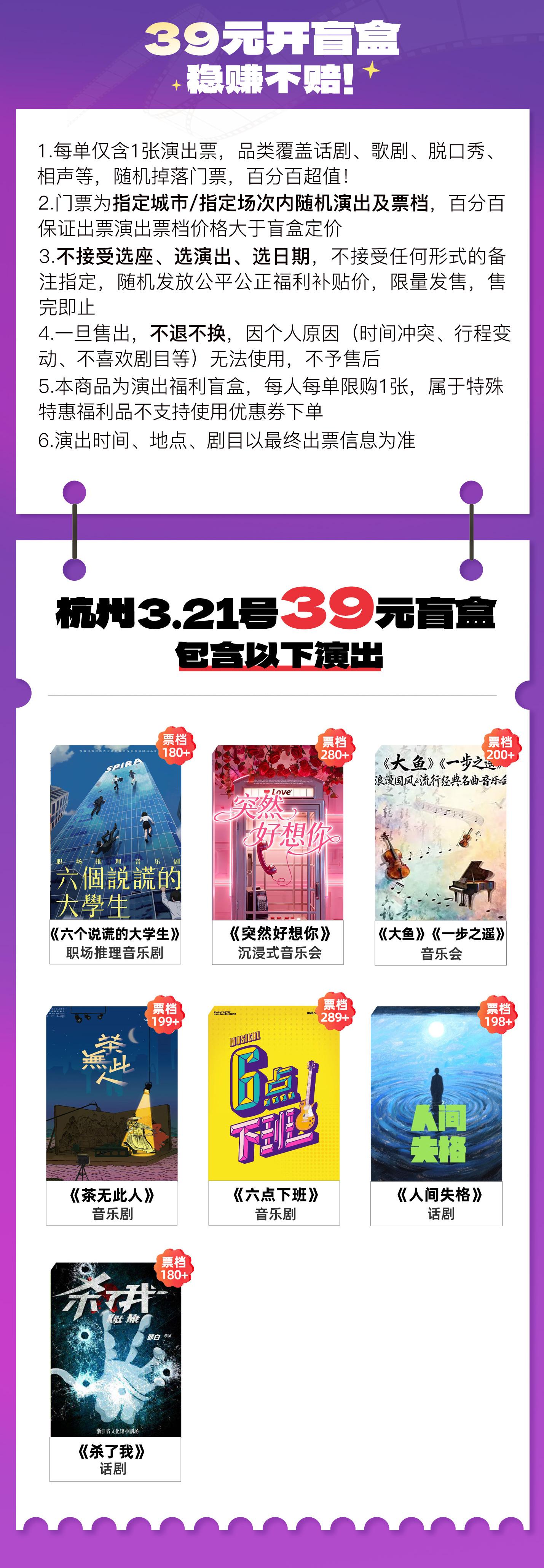 | 限购说明 | 每单限购1张 | 重复购票说明 | 同一位“实名观演人”请勿在多个售票平台重复购票,一位“实名观演人”的身份信息对应同场次的一张门票。 若同一位“实名观演人”被发现存在多个购票平台购买同场次行为,由该行为产生的无效重复订单、退票手续费、过期不可退票、无法入场等所有损失,均由购票人自行承担。 |