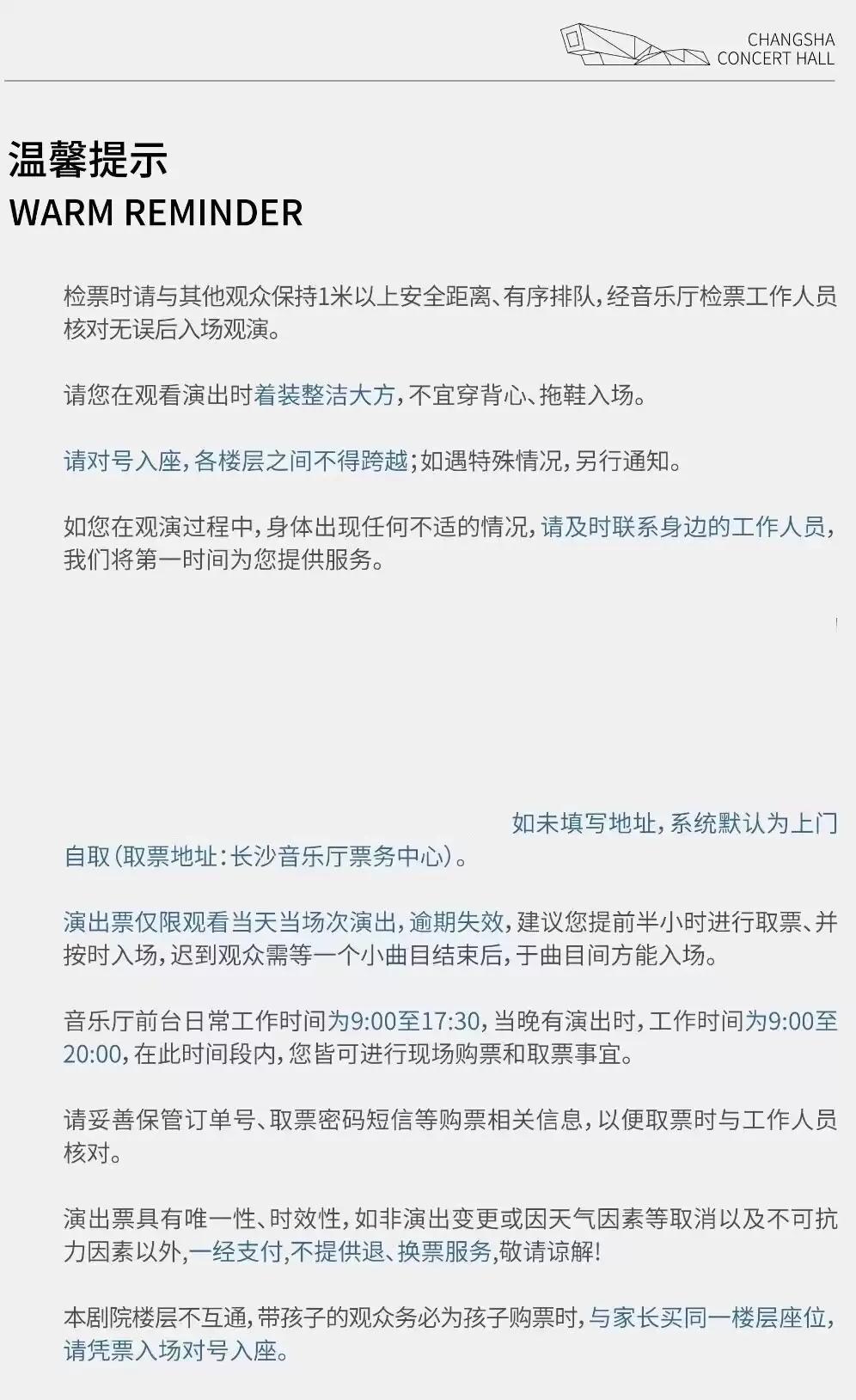 | 座位类型 | 请按门票对应座位,有序对号入座 | 儿童入场提示 | 此场演出1米以下儿童谢绝入场 |