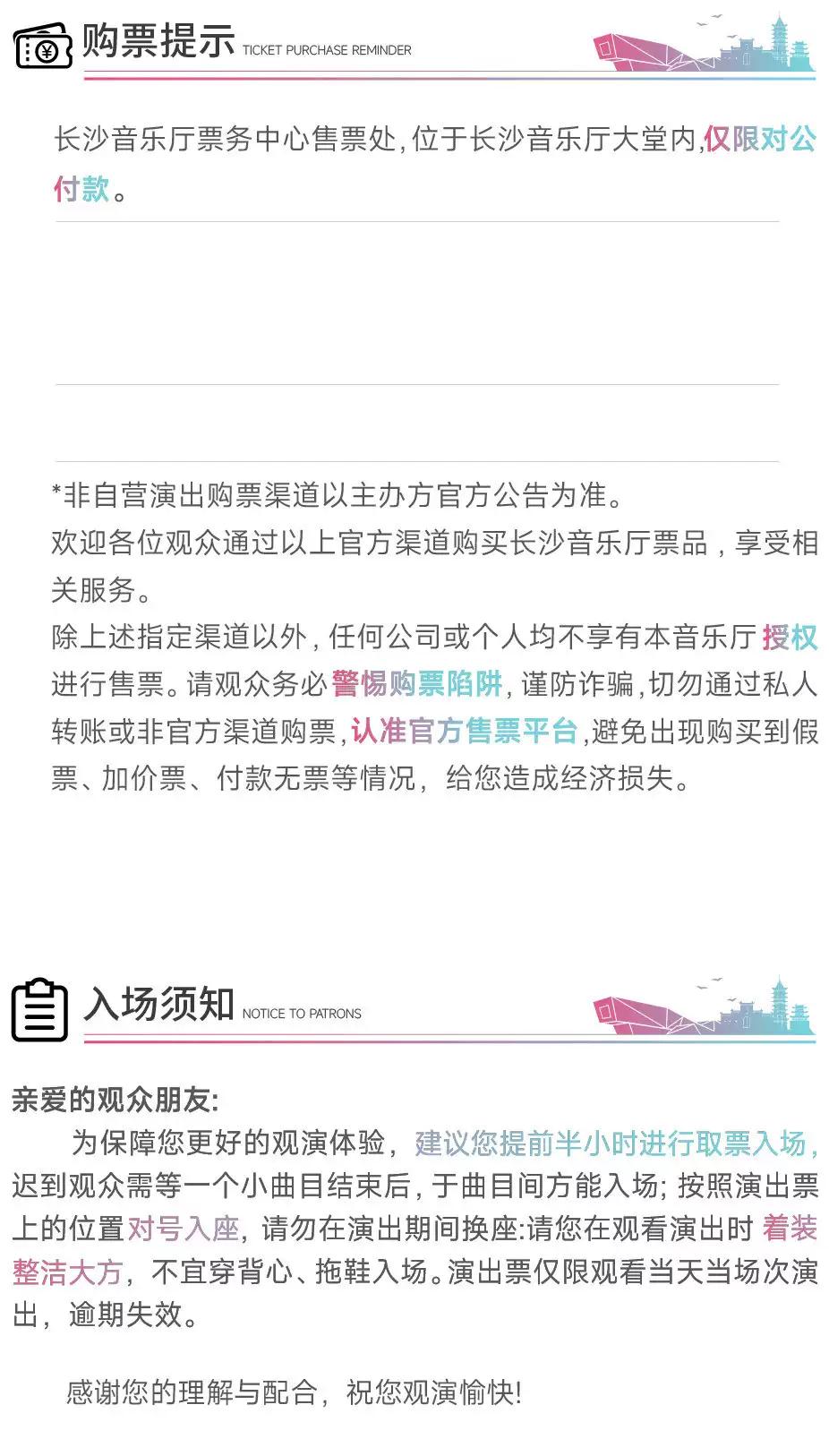 | 重要提示 | 演出现场气氛热烈,请您务必根据自身身体状况酌情是否购票参与观演,特别是患有心脏类疾病、急性心脑血管疾病、心肌炎、高血压等相关疾病的人群,请您务必遵照医嘱,结合病史及个人身体状况进行观演,观演期间请自行承担身体健康相关责任。 | 温馨提示 | 购买前请您提前规划好行程,做好相应准备,以免影响您的正常观演,感谢您的理解和配合。 若演出受不可抗力影响延期或取消,票牛将对演出票订单按照项目官方通知方案进行处理,其他因观演发生的费用需由您自行承担。 |