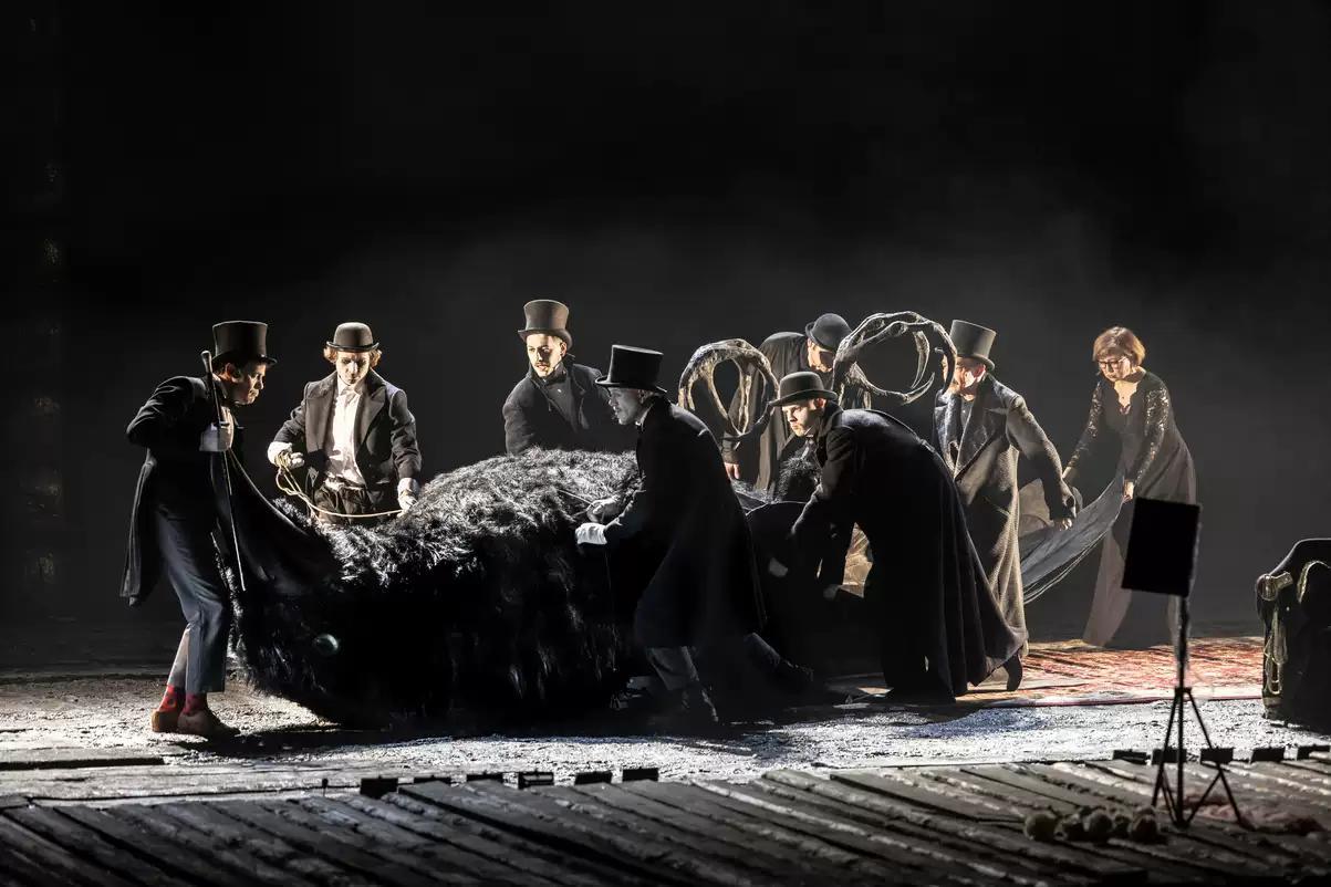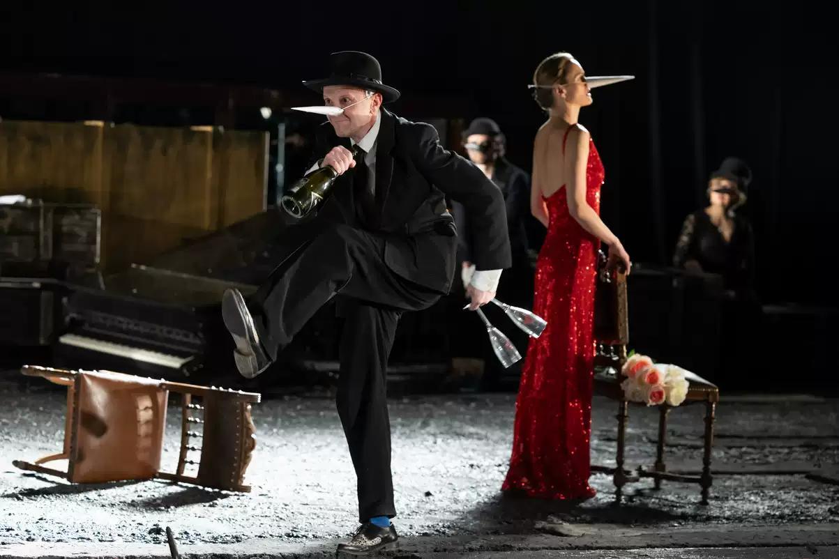 凭借《海鸥》问鼎金面具奖最佳导演的尤里·布图索夫重回莫斯科萨帝里孔剧院,选择的恰是这样一部作品。正如导演本人所说:“果戈里的戏剧早已被奉为神话,每个人都知道它在讲什么,所以我希望讲述的是《钦差大臣》为我们带来的变化和影响。”因此布图索夫与编剧米哈伊尔·杜尔年科夫共同将原著进行了大刀阔斧的删减,打散了连贯的戏剧冲突,也淡化了原有的阶层差异,让众多角色都有机会进行大段的回忆与剖白。而观众也将从这些喋喋不休中意识到,他们的谄媚、欺骗、趋利避害,全是在畸形社会中自幼习得的“生存智慧”。重要的不是谁是行贿者,谁是钦差大臣,而是官僚体系的逻辑与规则依旧可以执行下去。
