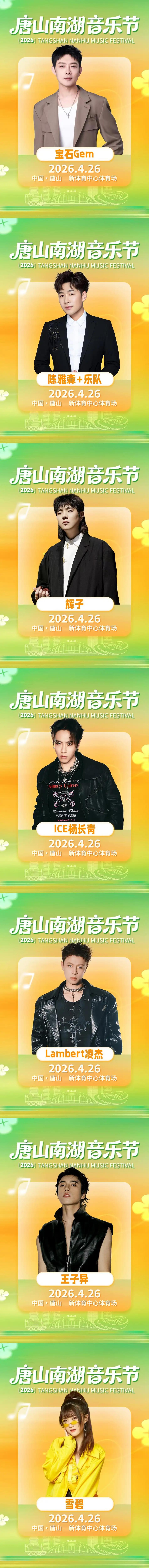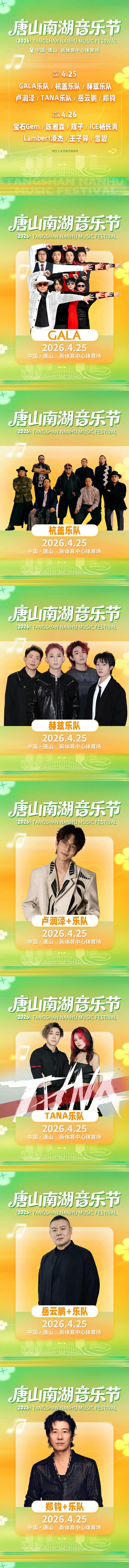 唐山南湖音乐节,一次迎接春天抵达的欢迎派对,一场为同频者而生的温度聚会。2026年4月25日至26日,唐山新体育中心体育场,14组精彩舞台轮番上演。郑钧、岳云鹏、宝石Gem、GALA乐队、杭盖乐队、王子异、辉子、ICE杨长青、TANA乐队、Lambert凌杰、卢润泽、赫兹乐队、雪碧、陈雅森华语乐坛顶 级音乐人们与你将共同见证凤凰之城真正意义上的音乐节现场,在超600分钟的律动里,我们诚邀您一起感受藏在这座百年工业名城深处的炽热。
