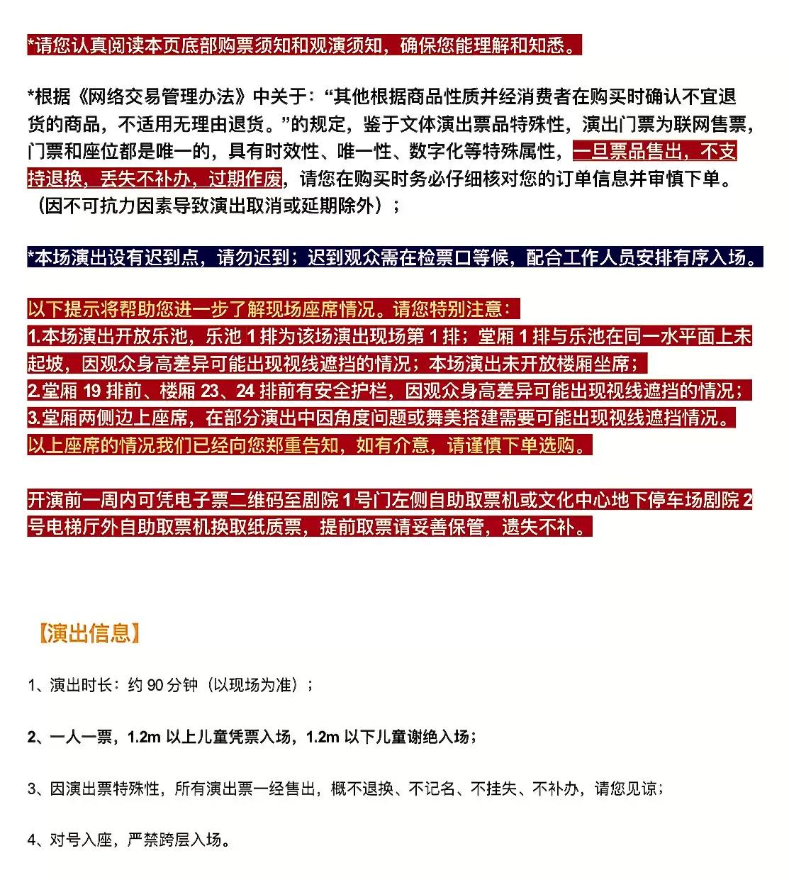 | 电子票 | 本项目支持凭电子票入场。 -请至少提前一天购买,开演前24小时内,票牛会发送取票短信,请按短信提示内容取票。 |