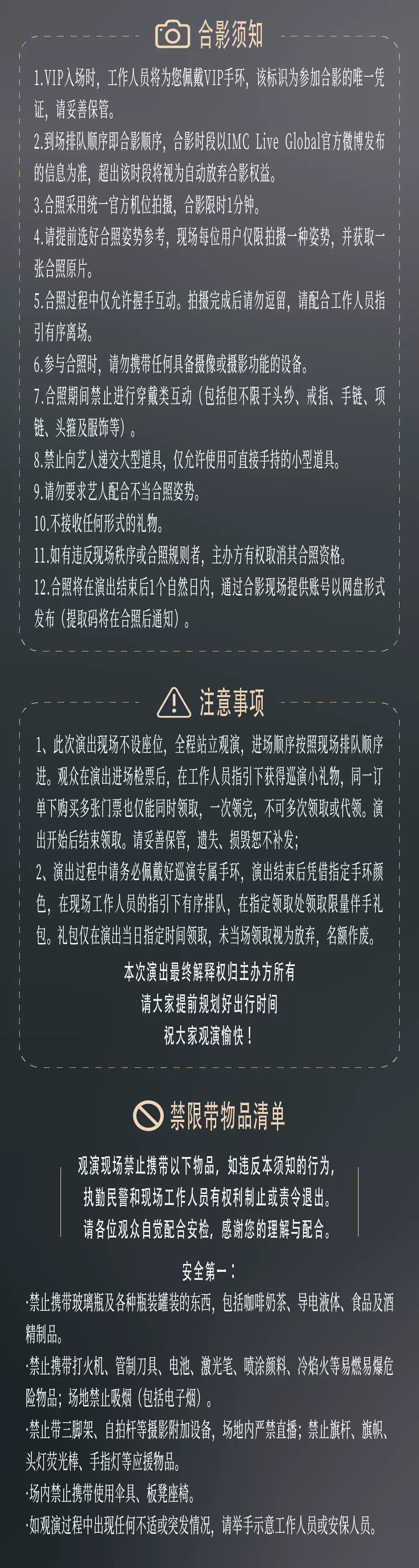 | 温馨提示 | 购买前请您提前规划好行程,做好相应准备,以免影响您的正常观演,感谢您的理解和配合。 若演出受不可抗力影响延期或取消,票牛将对演出票订单按照项目官方通知方案进行处理,其他因观演发生的费用需由您自行承担。 | 电子票 | 本项目支持凭电子票入场。 -请至少提前一天购买,开演前24小时内,票牛会发送取票短信,请按短信提示内容取票。 |