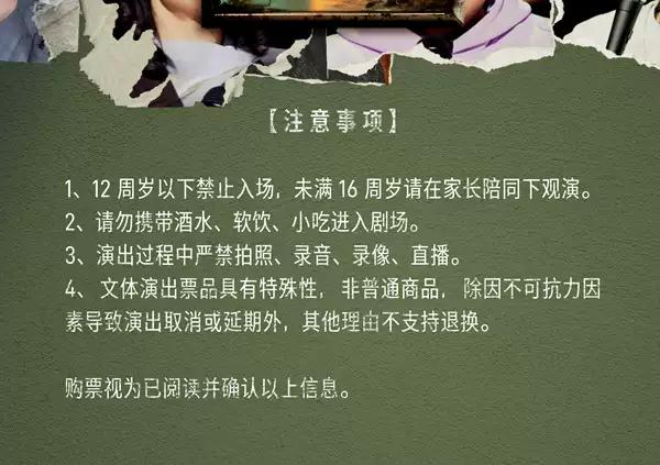 | 儿童入场提示 | 一人一票,12周岁以下禁止入场,未满16周岁请在家长陪同下观演,一经订购,不退不换。 | 禁止携带物品 | 食品、饮料、相机、充电宝、打火机等 |