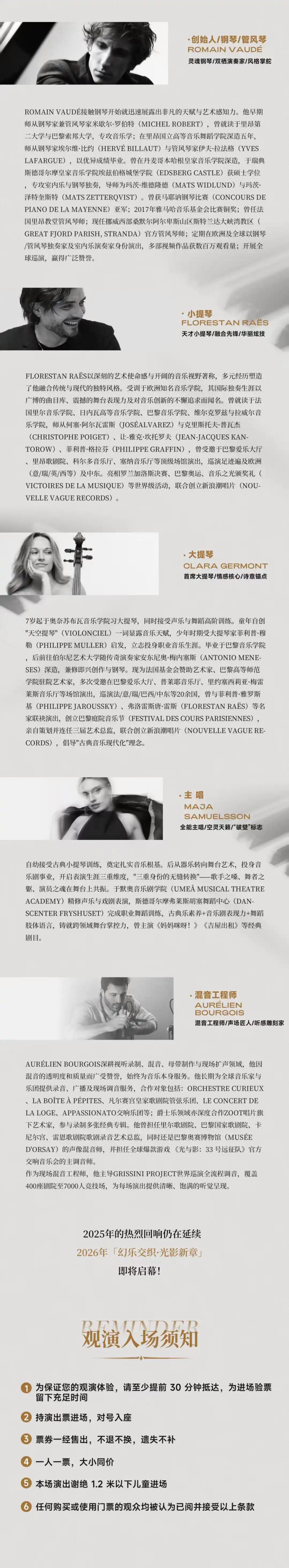 | 限购说明 | 每单限购6张 | 重复购票说明 | 同一位“实名观演人”请勿在多个售票平台重复购票,一位“实名观演人”的身份信息对应同场次的一张门票。 若同一位“实名观演人”被发现存在多个购票平台购买同场次行为,由该行为产生的无效重复订单、退票手续费、过期不可退票、无法入场等所有损失,均由购票人自行承担。 |