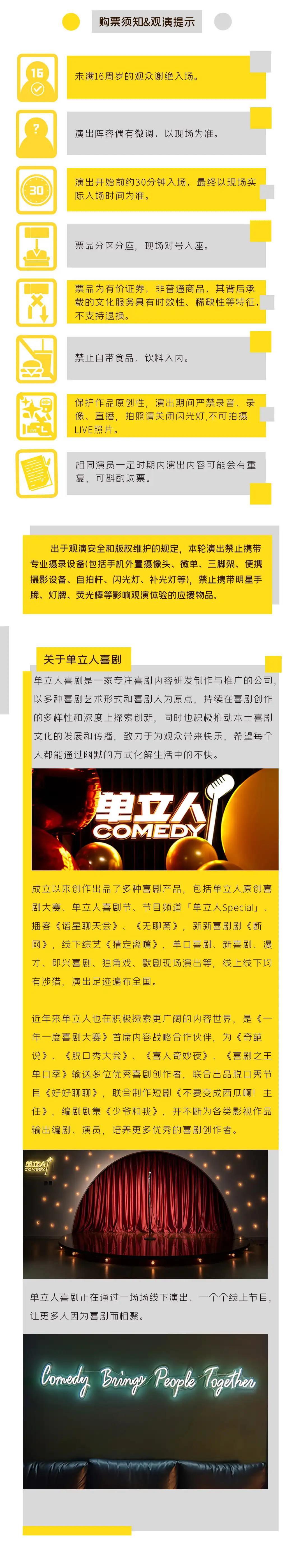 | 限购说明 | 每单限购6张 | 重复购票说明 | 同一位“实名观演人”请勿在多个售票平台重复购票,一位“实名观演人”的身份信息对应同场次的一张门票。 若同一位“实名观演人”被发现存在多个购票平台购买同场次行为,由该行为产生的无效重复订单、退票手续费、过期不可退票、无法入场等所有损失,均由购票人自行承担。 |