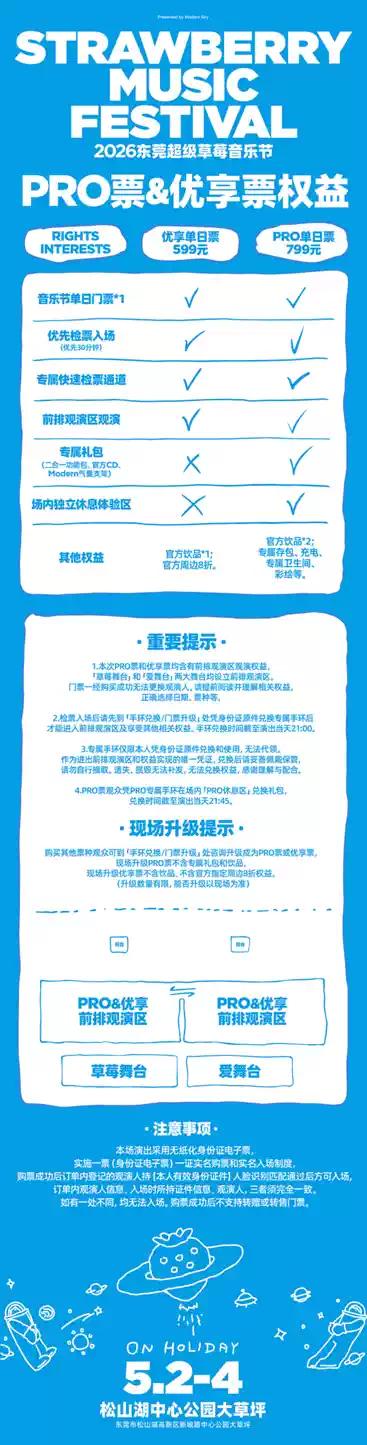优享单日票599元:含音乐节单日票门票1张,以及专属权益(草莓舞台和爱舞台前排观演;专属检票通道;优先30分钟检票入场;官方指定饮品×1;官方特定周边8折);