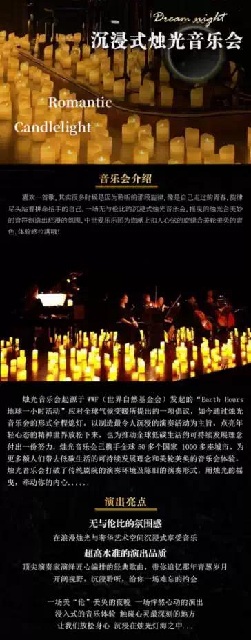 这一次,让我们以爱之名,把你的爱表达给TA听!沉浸式烛光音乐会,“关于你的一切”奏响在您的面前!让感情迅速升温,让此刻浪漫成为永 久的美好回忆……