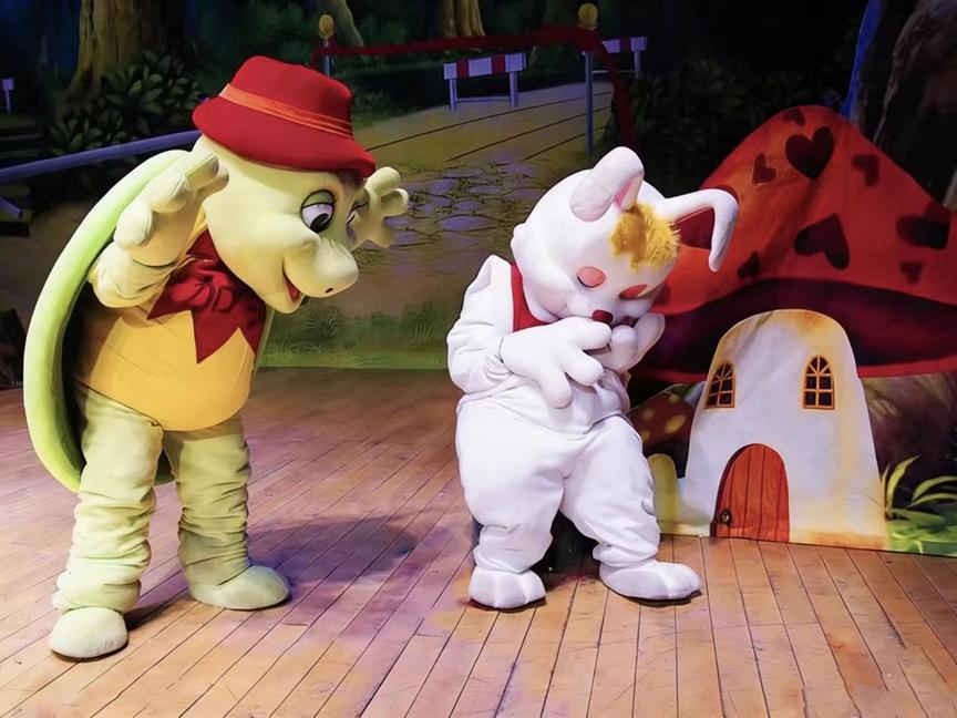 有着2000多年历史的《伊索寓言》里有很多经典故事,其中“骄傲失败,坚持胜利”的《龟兔赛跑》闻名于世,成为全世界教育孩子的第一课。本部儿童剧国内首次引用人偶服装机关技术,卡通人偶的脸不再是“表情如一”,而是随着剧情做出各种“生动表情”,带领现场小朋友进入梦幻的童话世界。
