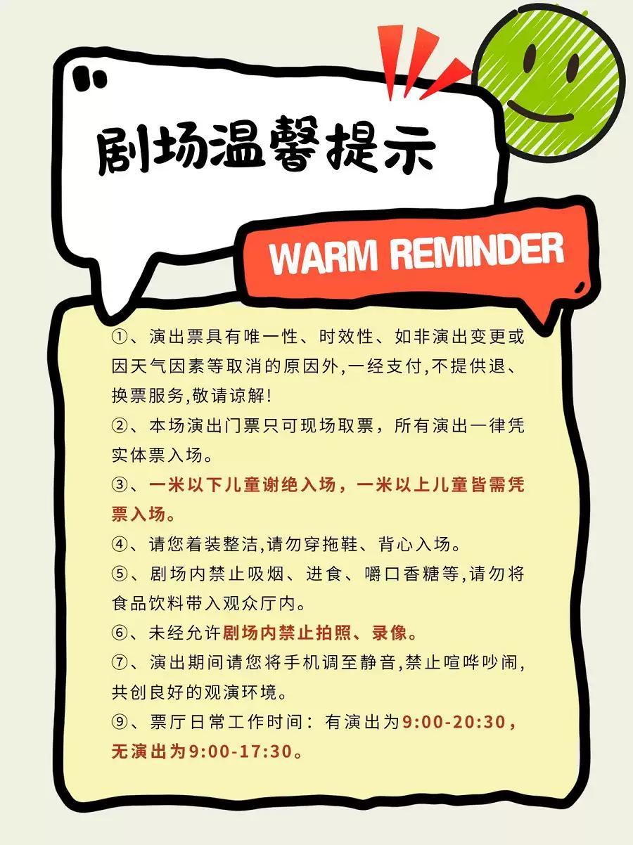 | 座位类型 | 请按门票对应座位,有序对号入座 | 儿童入场提示 | 一米以下儿童谢绝入场,一米以上儿童皆需凭票入场 |