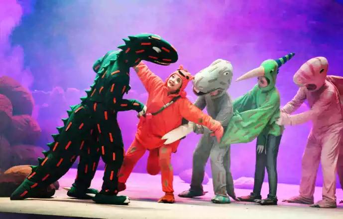 舞台上的恐龙们可谓色彩斑斓、可爱而充满童趣,完全颠覆了《侏罗纪公园》里冰冷残暴的恐龙形象。以毛绒面料为主为各种恐龙量身定做的“恐龙服”全都舒适柔软,仿佛一个个具有生命力的超级大布偶。 剧中的服装造型根据恐龙们性格和表演的不同而相互有异。比如有些显得娇小、憨态可掬、并且能够行动自如,肢体表演丝毫不受影响;而有些则是十分庞大,例如为翼龙量身定做的服装,纵长将近两米,穿上它的演员将通过服装内置手柄控制恐龙的头与尾的动作。