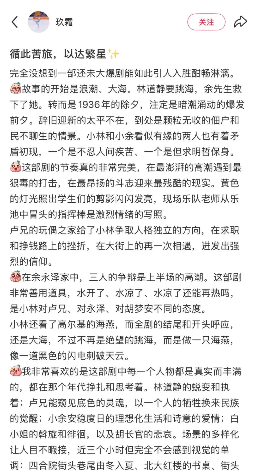 故事讲述了女大学生林道静在20世纪30年代动荡时艰的时代背景下,从迷惘中逐渐完成自我精神觉醒,成长为独立自信、勇敢坚定的青春奋斗者的成长历程。在她的人生轨迹中,不同人物的理想、情感与生存选择交织成鲜明的群像。卢嘉川所代表的信仰之路、余永泽所徘徊的利己之途,以及胡梦安所追逐的名利之道,这些“他们”的故事,也正折射出当下“我们”在人生定向上的思考——当人生来到抉择的时刻,我们将如何做主自己的青春?