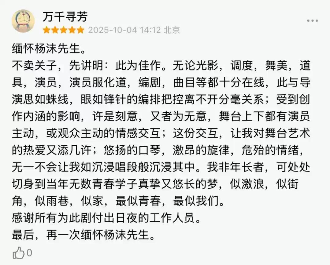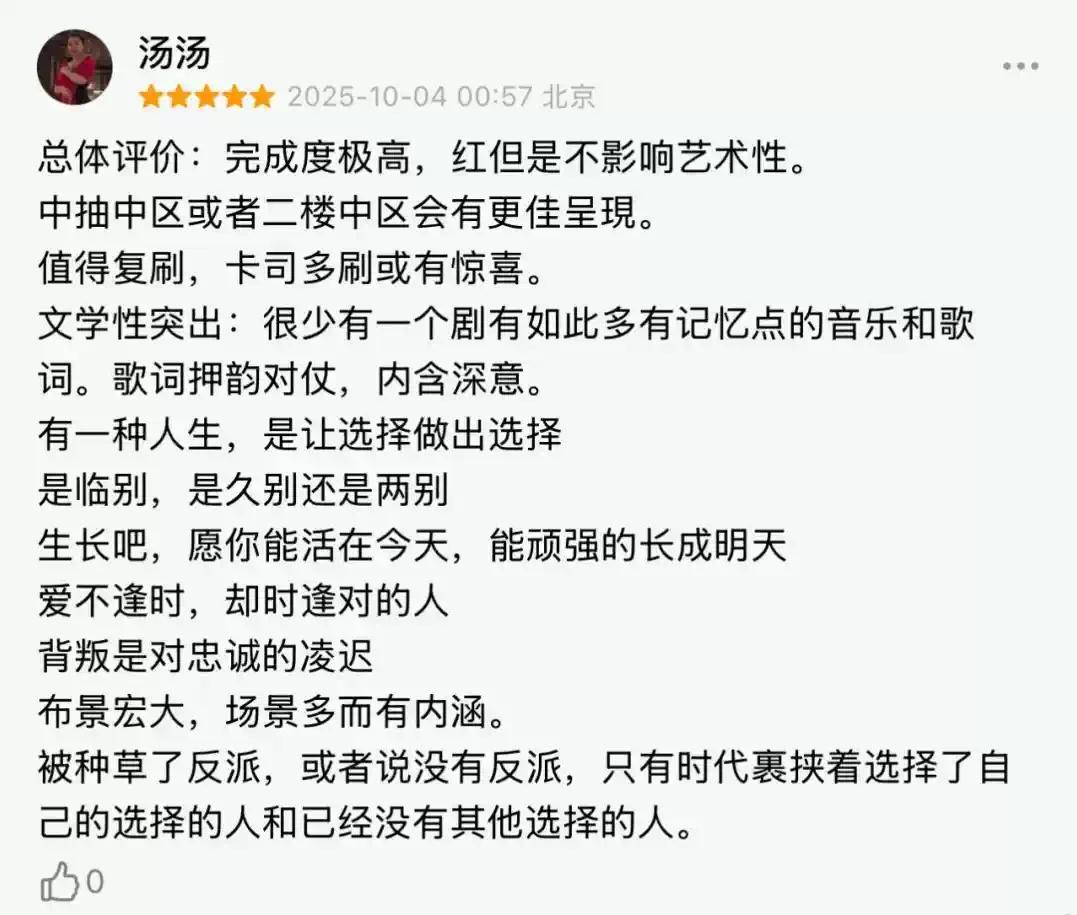 首轮公演后,剧目在豆瓣、大麦、小红书等平台口碑爆分,他们说:这就是国家队的实力、是今年为止音乐剧的顶 级制作——太强悍;他们说:无论编剧,作曲,光影,调度,舞美,演员,多媒体,服化道等都十分在线——太用心;他们说:主题作品且艺术性甚佳,完成度极高——太难忘。