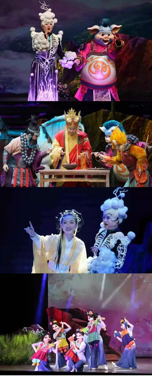 大型神话木偶剧《悟空·三打白骨精》,以经典名著《西游记》“三打白骨精”段落为内容基础,从三次与白骨精的对打中,提取“第三打”进行了大刀阔斧的创新和重构。在内容上,相较于传统版本,故事节奏更快,情节更加复杂化。白骨精不再是单兵作战,而是加入了阿风、阿木两个新角色,和唐僧师徒四人展开了团队战的较量。在新角色的帮助下,白骨精一反常规打法,成功抓住了唐僧,不过正义终将战胜邪恶,最终,取经团队齐心协力战胜了白骨精。在角色塑造上,该剧赋予英雄主义以当代气质。如白骨精,不再是单一的妖魔形象,而被赋予了更多人性和复杂性,成为一个有情感和动机的角色。孙悟空,从全能的英雄转变为一个普通人中的英雄,面临真实的挑战和局限,展现了更人性化的一面。唐僧则被赋予了更鲜明的领导能力,猪八戒则更加具有了担当,展现出不同于传统形象的英雄特质。 本剧是一台人偶结合的舞台剧,在演员本体的表演上,运用多种偶剧的表演形式,结合不同的故事场景、角色人物,提高舞台表现力。偶的表现形式丰富多样,包含杖头木偶、面具偶、巨型偶、托偶(也称“人性化偶”)、框架偶、铁枝木偶、偶型、影偶共8种偶,其中,师徒四人、白骨精、阿风、阿木这七位主要角色的形象均使用面具偶这一表现形式,戴在脸上的面具给予角色的风格化、性格化形象,同时解放了演员的肢体,让演员更灵活的表演及塑造动态化的角色,给了演员创作的空间。其他人物形象上,小猴子使用铁枝木偶表现,白龙马则使用框架偶来表现,阿木的蜘蛛跟班使用偶型表现,色泽上以彩色为主,形象卡通,充满童趣。白骨夫人变出的少女和大妈,则是用托偶(人性化偶)来表现,即演员的脸与小偶型身体相结合,形成一种大头小身的玩偶造型,诙谐滑稽。偶的运用除了在人物形象的塑造上有所设计之外,在不同戏剧场面中也有偶的表现形式。在孙悟空与白骨精的武打场面,就运用了杖头木偶以及巨偶两种表现方式,在真人武打中切换至杖头木偶的表演,体现多时空的打斗变换。 这部戏以“流行元素融合古典艺术”的理念进行创作,在保持原有精髓的同时,通过直接和有趣的叙事,深入浅出地探讨角色之间的冲突和困难,使故事更符合当代观众的需求。总之,节奏快,亮点多,形式丰富,诙谐欢乐,是本剧的特点,也是风格,旨在为观众呈现一台丰富多彩、明快活泼、热情与激情并存的神话木偶剧。 |
