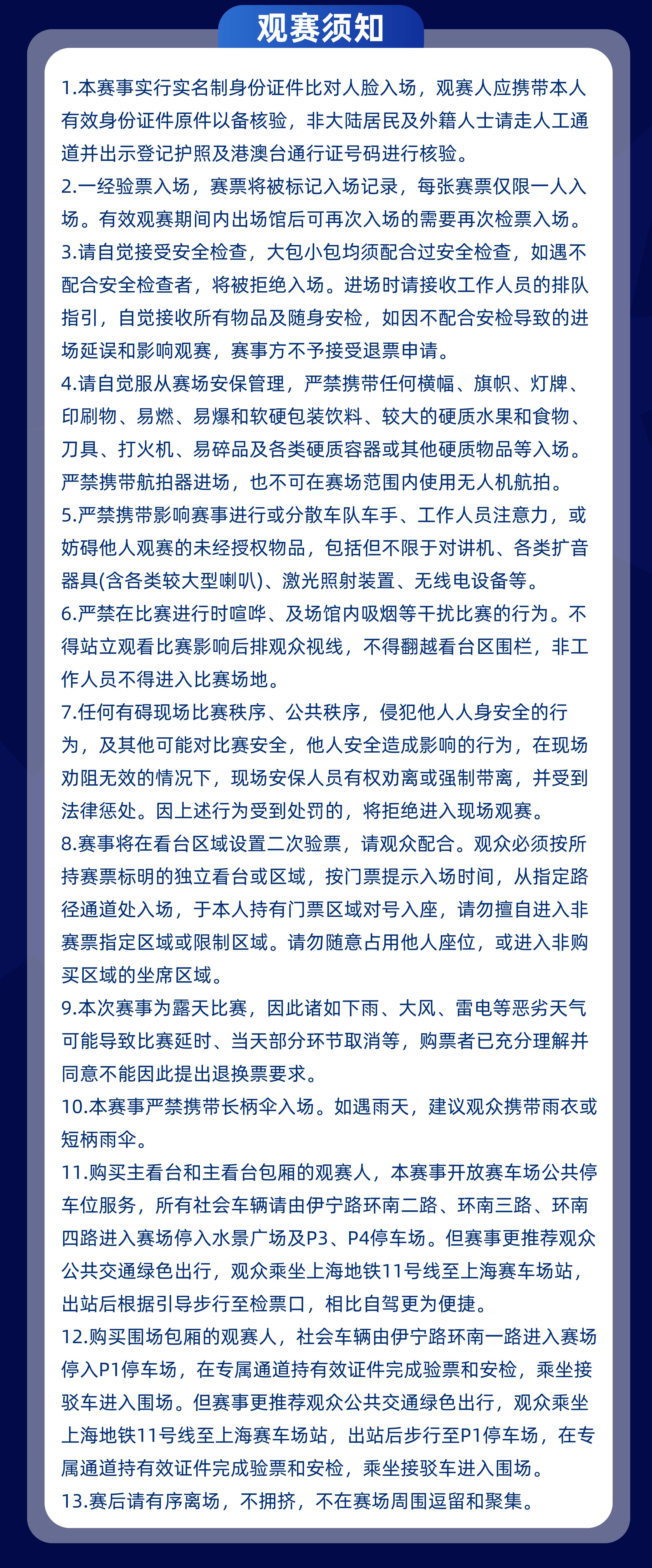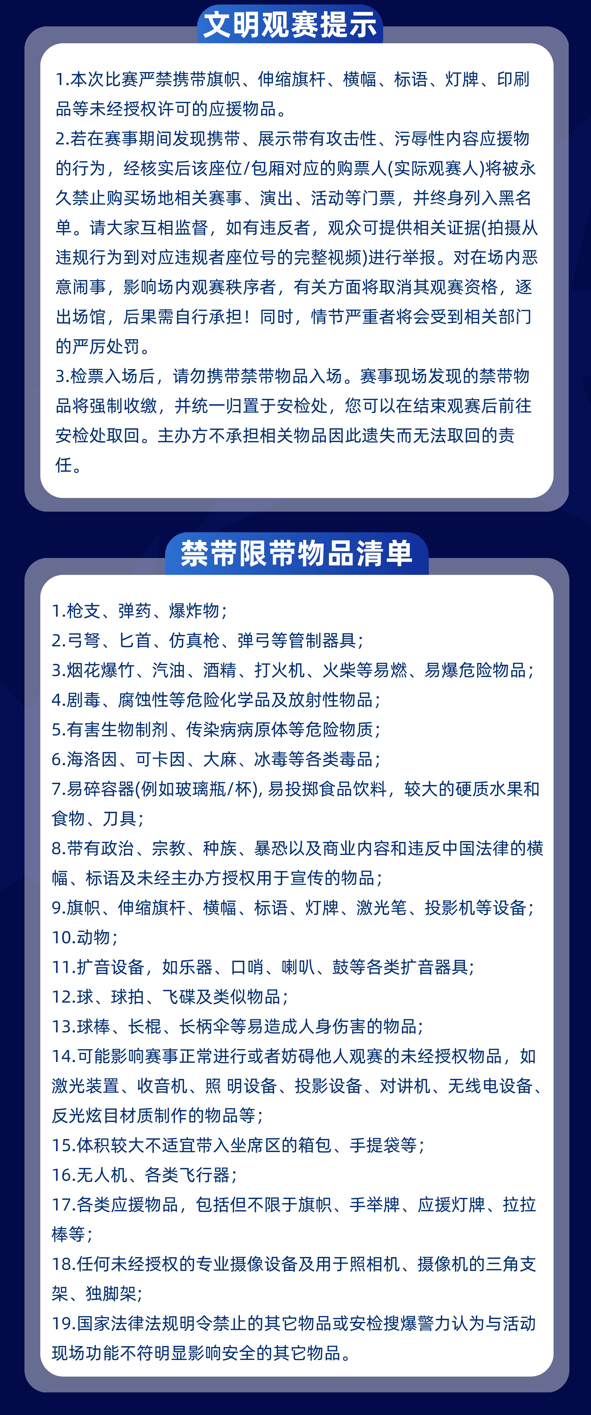 | 儿童入场提示 | 一人一票一座,携六岁以下儿童入场的关注请携带户口本岛现场人工通道进行核验进场 | 禁止携带物品 | 食品、饮料、相机、充电宝、打火机等 |