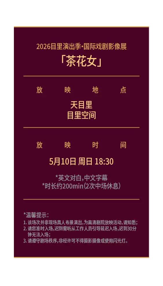 2026目里演出季·国际戏剧影像展:剧目为高清放映项目,无真人演出,观影环境见下图。