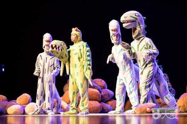 "1……2……3……很好吃!",原来这种大家孩提时代经常玩到的"红灯……绿灯……停!"的游戏,在白垩纪恐龙时代也是相当流行。剧中的主角小甲龙"很好吃"干脆把它变成了自己的专属游戏,在台上和众恐龙把"1……2……3……很好吃!"玩的不亦乐乎。连一向残忍的霸王龙也沉浸在游戏的欢乐中,不知不觉竟然把自己的"食物们"都放走了。"你动了!你输了!"恐龙们憨态可掬的表演,使得现场欢笑不断。