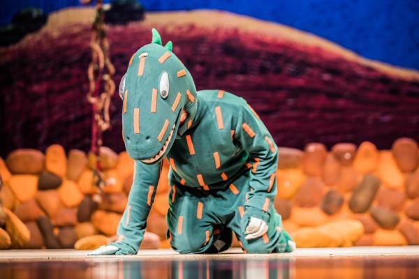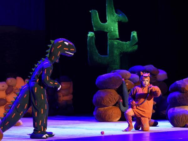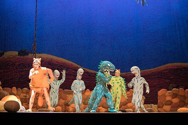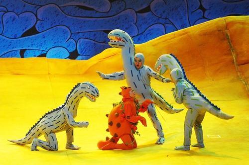 "1……2……3……很好吃!"原来这种大家孩童时代经常玩到的"红灯……绿灯……停!"的游戏,在白垩纪恐龙时代也是相当流行。剧中的主角小甲龙"很好吃"干脆把它变成了自己的专属游戏,在台上和众恐龙把"1……2……3……很好吃!"玩的不亦乐乎。连一向残忍的霸王龙也沉浸在游戏的欢乐中,不知不觉竟然把自己的"食物们"都放走了。"你动了!你输了!"恐龙们憨态可掬的表演,使得现场欢笑不断。