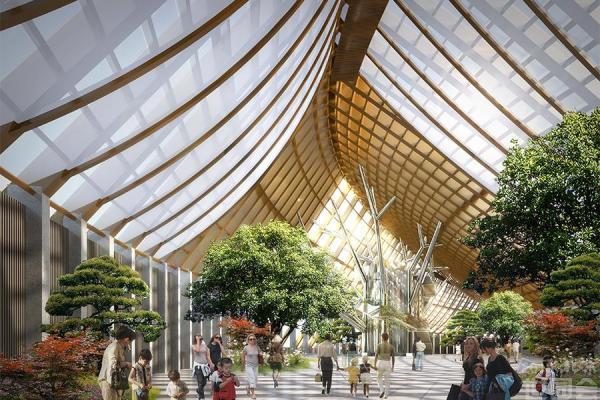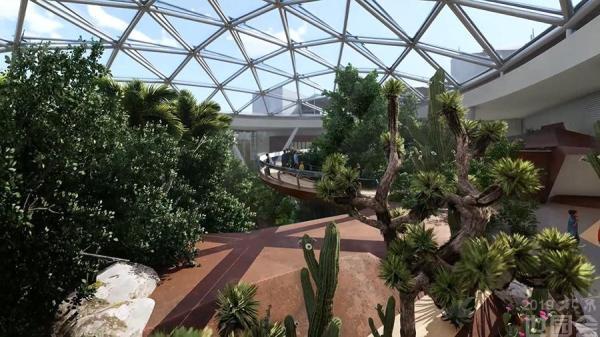 植物馆建筑面积约10,000平方米,建筑设计理念为"升起的地平",建筑表面机理以植物根系为灵感,庞大的垂坠根系向下不断蔓延,将植物原本隐藏于地下的强大生命力直观呈现给参观者,不仅产生强烈的视觉冲击,更带领参观者踏上一场以感受植物根系力量为起点的奇妙植物世界之旅。