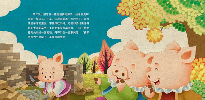 三只小猪误认为狼要吃他们,结果各自建造了自己认为**安全的房屋,结果,一个个的都被狼吹到了,当来到猪老三的石头房后,才将误会解开,三只小猪承认错误,决定帮助狼一起造房子,从此三只小猪改掉了身上的坏毛病,猪妈妈也特别高兴,狼和三只小猪一家成为了好邻居。