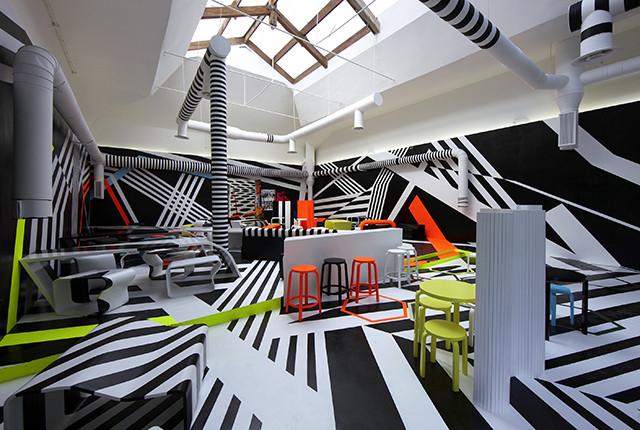 在雷贝格的展览中,观众通过多重感官的审美体验,在观看作品的同时也不断改变着作品的面貌,其观看与参与赋予作品新的含义。占据美术馆顶层的是一间酒吧,也是一件社会雕塑。与上海本地的酒吧Blackbird合作,这间酒吧只在夜晚营业。从天花板、地板到家具,酒吧的所有表面都被艺术家的图案覆盖,延续了他以炫目的迷彩为灵感的系列创作。雷贝格的许多作品都以这一主题为基础,其中包括他在第53届威尼斯双年展上获得金狮奖的装置作品。