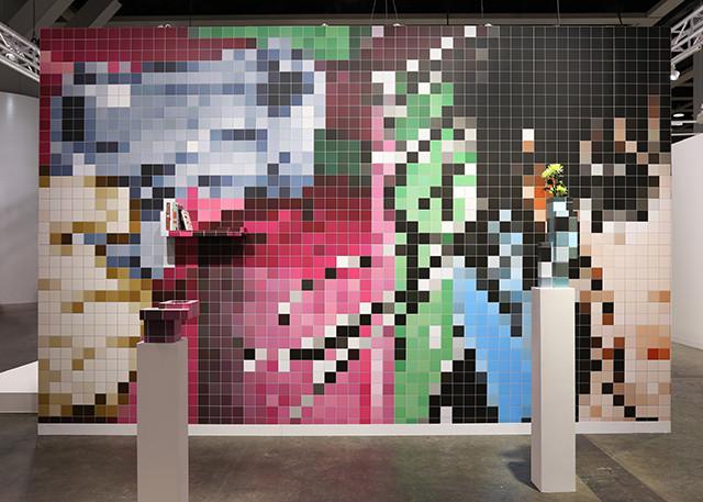 环绕着五楼四壁的是艺术家正在进行的《像素系列》(2015年至今)的**版本,观众需要不断调整角度和距离,识别由单色马赛克砖组成的、被像素化的消费图像。根据观众视角的不同,这件作品时而是抽象的色块,时而化作全景的景观。