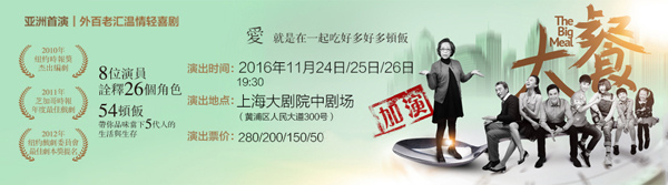 外百老汇温情轻喜剧《大餐》改编自美国近来备受瞩目的剧作家丹.勒弗兰克(Dan LeFranc)新作《大餐》(The Big Meal),美国《芝加哥时报》剧评赞誉此剧为该年度最佳戏剧,并获得「纽约戏剧委员会」最佳剧本奖提名的殊荣,2012年上演于美国外百老汇,现正于美国多个城市热演。