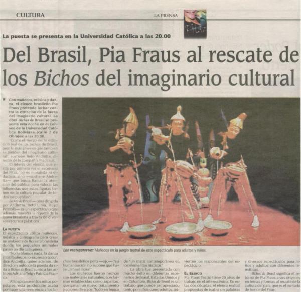 一部非语言剧目,表演者和50 多个废弃材料做成的木偶,加上鲜艳的代表巴西元素的色彩,给大家展示了一部奇幻、激昂、异族风情的巴西文化剧目。该剧获得2010年加拿大木偶街接头表演奖