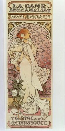 穆夏为莎拉·伯恩哈特设计的六幅海报中的第二幅是*精美的。其淡雅的配色、粉紫色背景中的银色星星、身着白袍头戴白色茶花的女演员、一只神秘的仿佛代表宿命的手在左下角轻举着另一株茶花,以及顶部“受伤的心”的装饰——所有这些装饰性元素形成一幅**震撼力的整体。