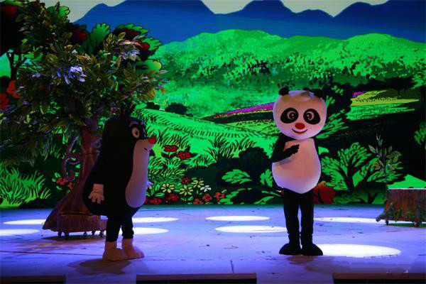卡通舞台剧《熊猫和小鼹鼠》故事梗概:朱雀红和朱雀蓝举着"微飘"在森林里飞来飞去,传递一条叫人惊喜的信息:熊猫的好朋友、可爱的小鼹鼠决定在中国的森林里安家。这个信息一下子成了爆炸新闻,森林里的小动物们乐翻了天,他们动脑筋,为小鼹鼠准备各种奇特的礼物,有的准备了五星级竹床,有的准备了核桃、花生、板栗等干果,也有的准备了新鲜的蔬菜水果,还有的编织了精美的地毯。狐狸这两天行动诡秘,引起了小动物们的疑心,设立了瞭望哨用望远镜观察,分两路兵马暗地里跟踪,看狐狸到底要搞什么鬼名堂……温暖助人的爱心,好看好玩的故事,让观众从进了剧场就兴奋、激动、开怀畅笑。