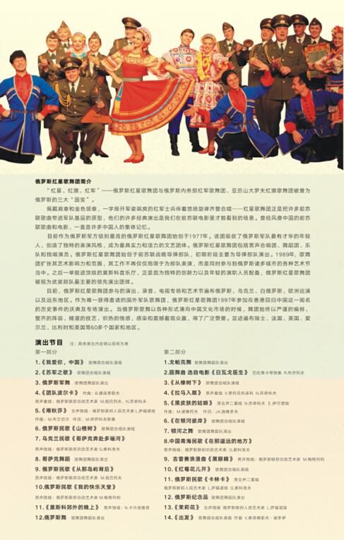 “红星、红旗、红军”--俄罗斯红星歌舞团与俄罗斯内务部红军歌舞团、亚历山大罗夫红旗歌舞团被誉为俄罗斯的三大“国宝”。