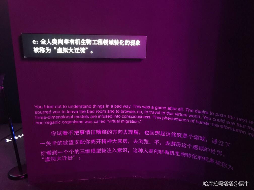 展品不算多,但挺酷。喜欢一楼的机器人偶和二楼的意识暂留区的体验。喜欢这句“这无情的世界因为有热情的蠢货,才有些浪漫。”