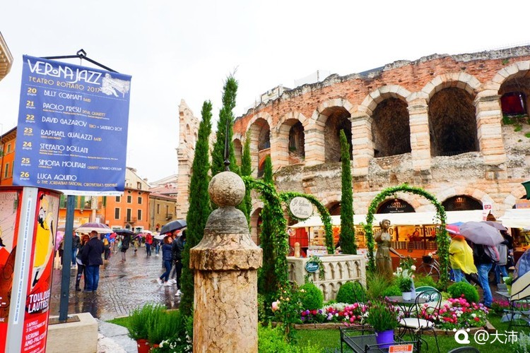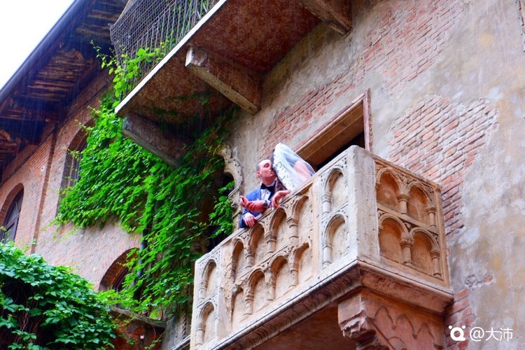 再说Verona。我路过这座古城那天正在下雨,但依然挡不住满城爱的气息。这座城就是因为罗朱爱情而远赴盛名,被称为爱之城。然而罗朱的故事仅是在文学改编中被设定在了这个城市,红蓝两大家族并未真正在这里生活过。再加上莎翁戏剧的巨大影响力,那个不得已被建造出的朱丽叶从未站过的阳台,每年吸引着数百万游客慕名而来。我也刚巧拍到一对新人在这里驻足一吻定情。“故居”的墙壁上,无数爱情誓言的涂鸦,就是游客们趋之若鹜来此爱情圣地朝拜的证明。其实Verona不仅有罗朱,这里同样保存着古罗马竞技场,歌剧美声也随处飘荡,所以找个时间再去一次这座城市,一定是不二之选。