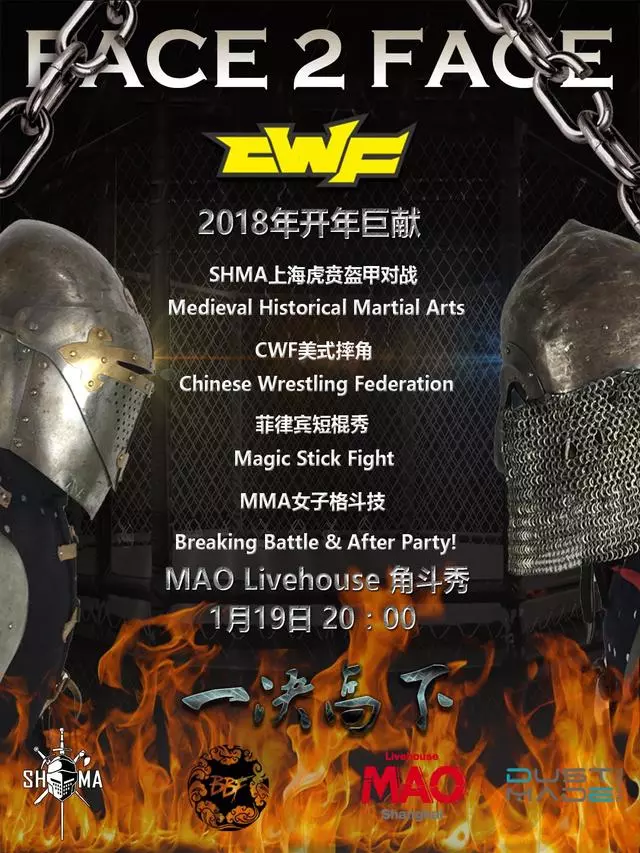 阵容:SHMA上海虎贲盔甲对战(史实兵器展)、CWF美式摔角猛兽、MMA女子格斗技、菲律宾短棍秀、Breaking Battle & After Party!