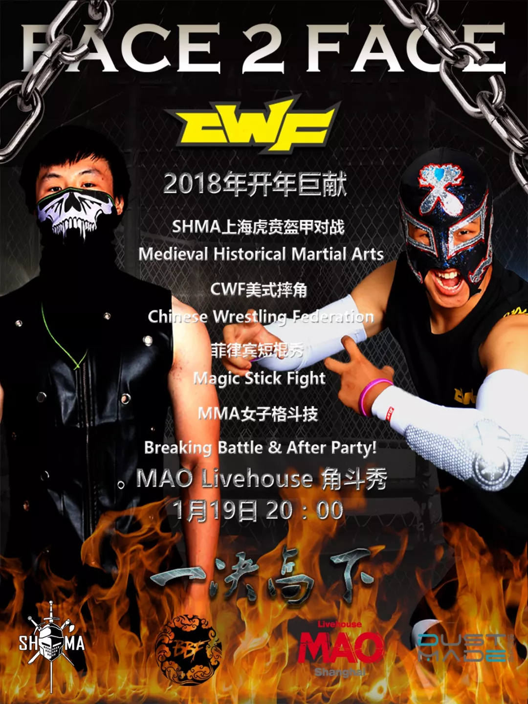 CWF中摔联盟致力于摔角在中国的普及,目前已成功举办多场公开赛,培养了众多个性十足的摔角手。在1月19日的MAO LiveHouse,摔角手们将用拳头解决他们之间的恩怨。