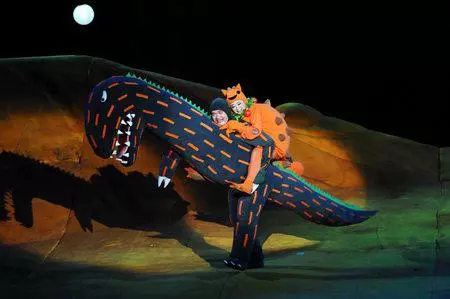 “1……2……3……很好吃!”,原来这种大家孩提时代经常玩到的“红灯……绿灯……停!”的游戏,在白垩纪恐龙时代也是相当流行。剧中的主角小甲龙“很好吃”干脆把它变成了自己的专属游戏,在台上和众恐龙把“1……2……3……很好吃!”玩得不亦乐乎。连一向残忍的霸王龙也沉浸在游戏的欢乐中,不知不觉竟然把自己的“食物们”都放走了。“你动了!你输了!”恐龙们憨态可掬的表演,使得现场欢笑不断。